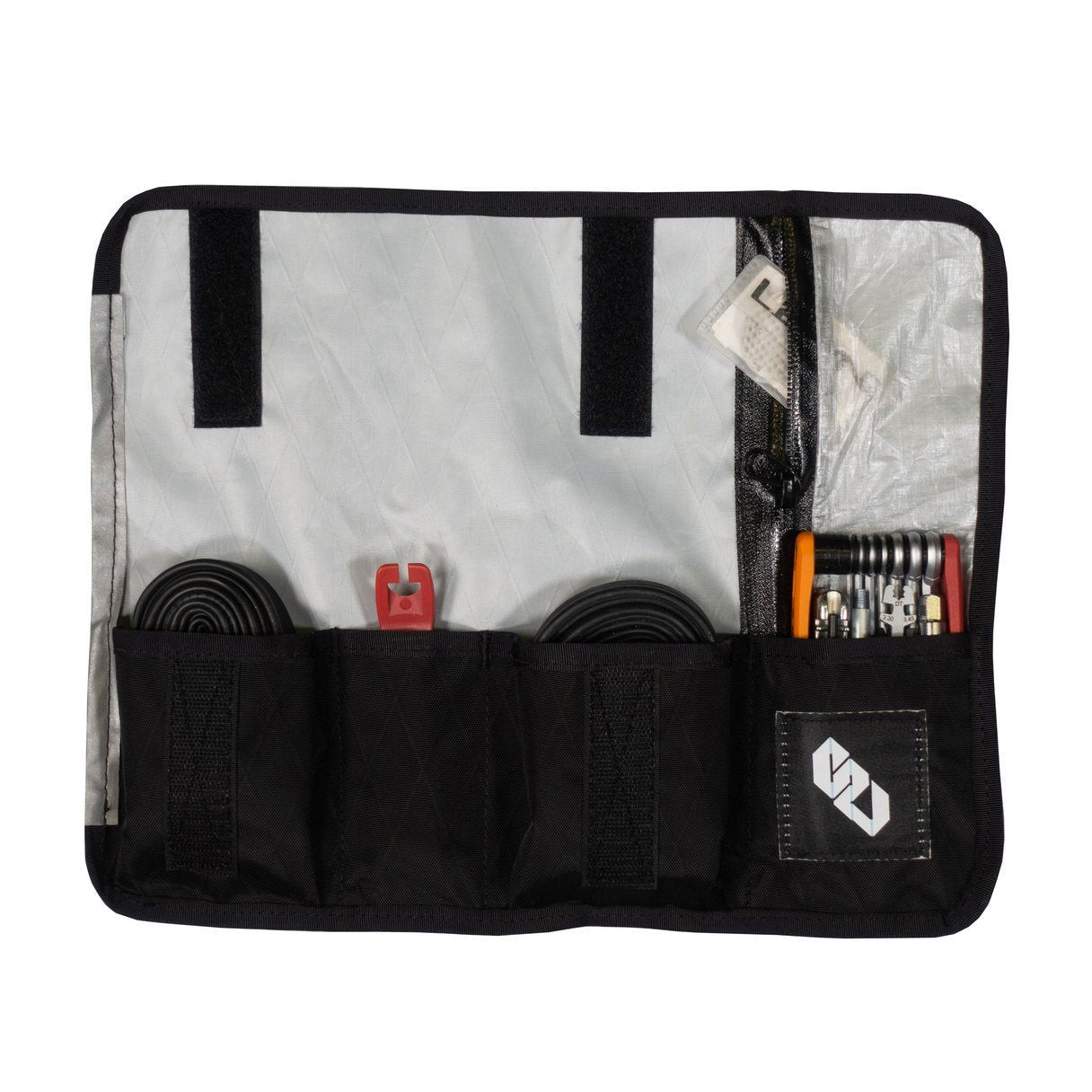 The next step in the evolution of the saddle roll. Designed to hold two road or gravel tubes, tire levers, a multi tool, CO2, as well as miscellaneous small parts. A waterproof zippered Dyneema pocket offers a lightweight, abrasion resistant, yet still see-through solution for carrying patch kits, valve adaptors, and chain links.