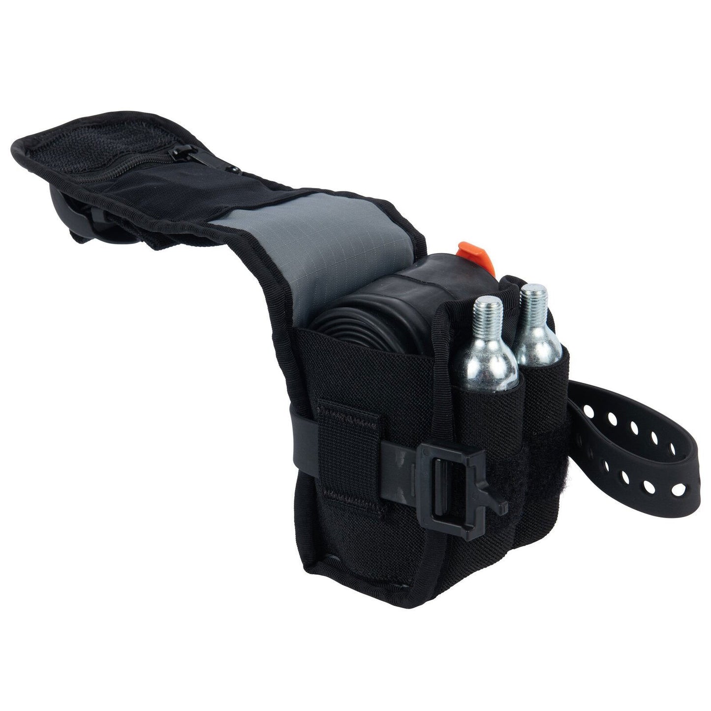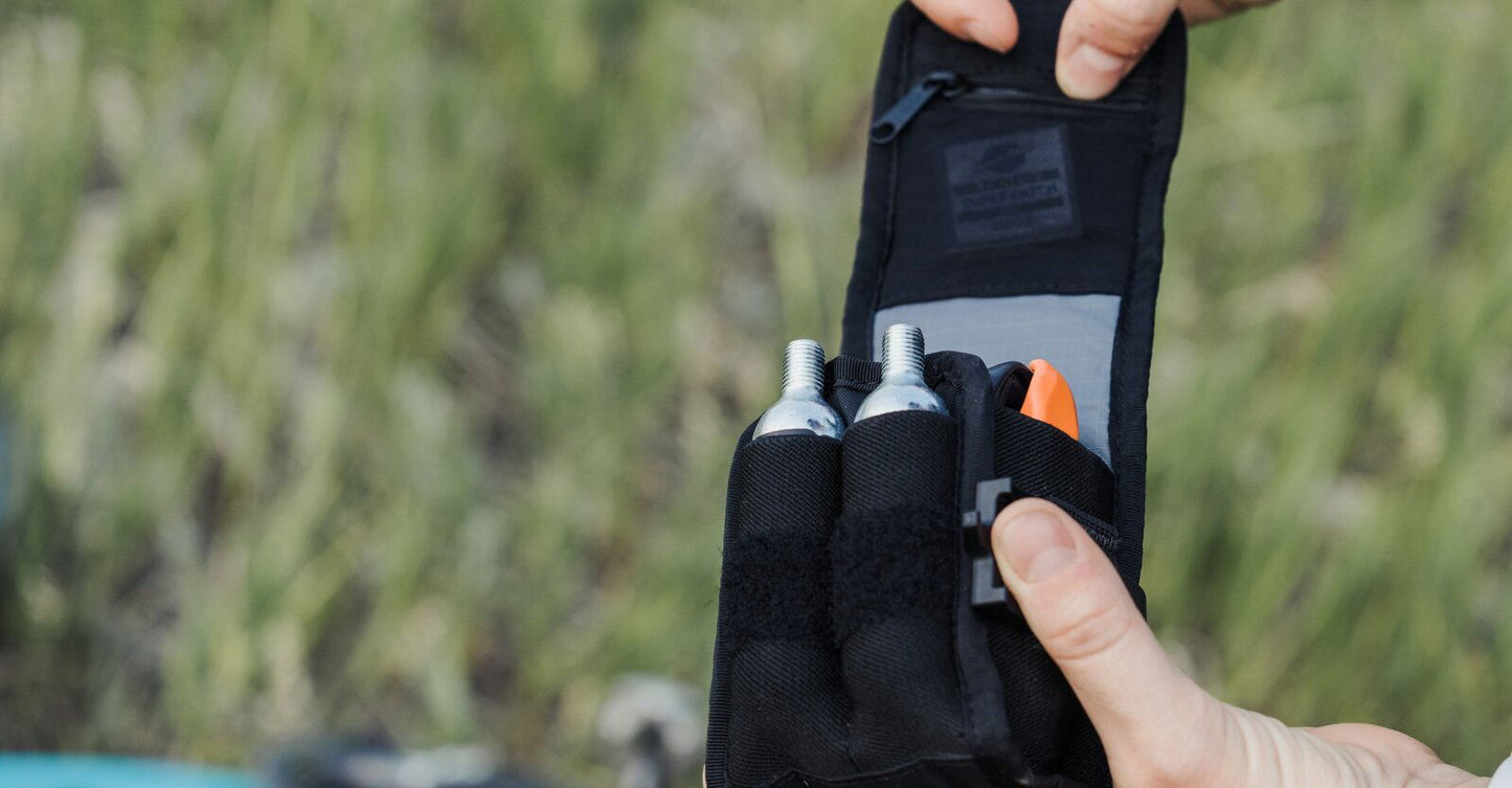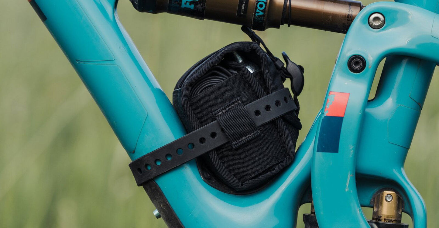 Introducing our first mountain bike accessory. The trail pal. That buddy who is always happy to go with the flow. Down tube, top tube, seat tube, even under the saddle: Wherever you attach him he will stay put. Non-slip material keeps the trail pal settled no matter where you wanna go. Side elastic sleeves hold a multi-tool and tire levers. It is big enough for a 29er tube and there is even a small zippered pocket for tiny items like chain links or lucky charms.
