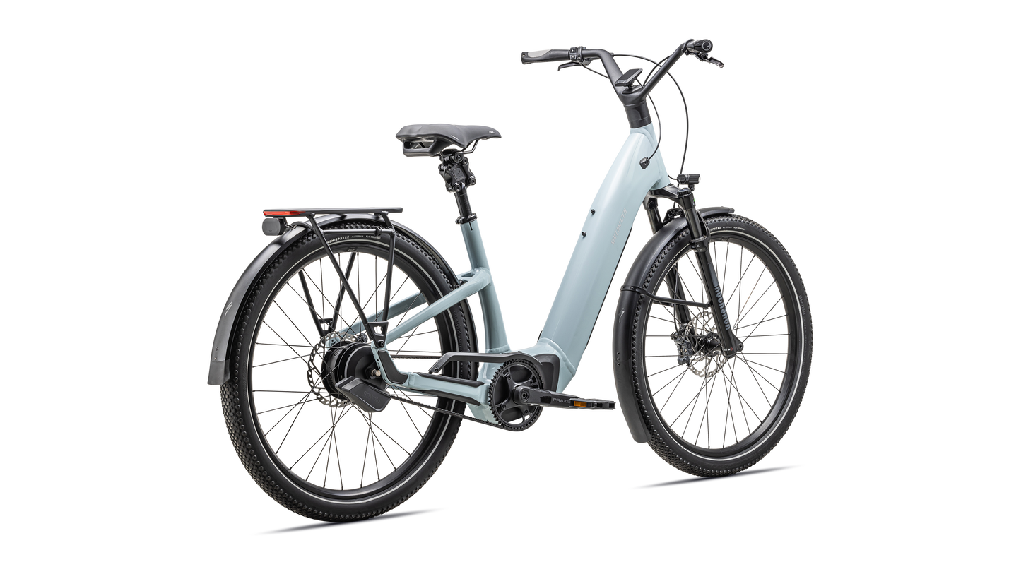 E5 Aluminum, bottom bracket motor mount, fully integrated &lockable downtube battery, internal cable routing, lock and front rack mount, sliding dropout