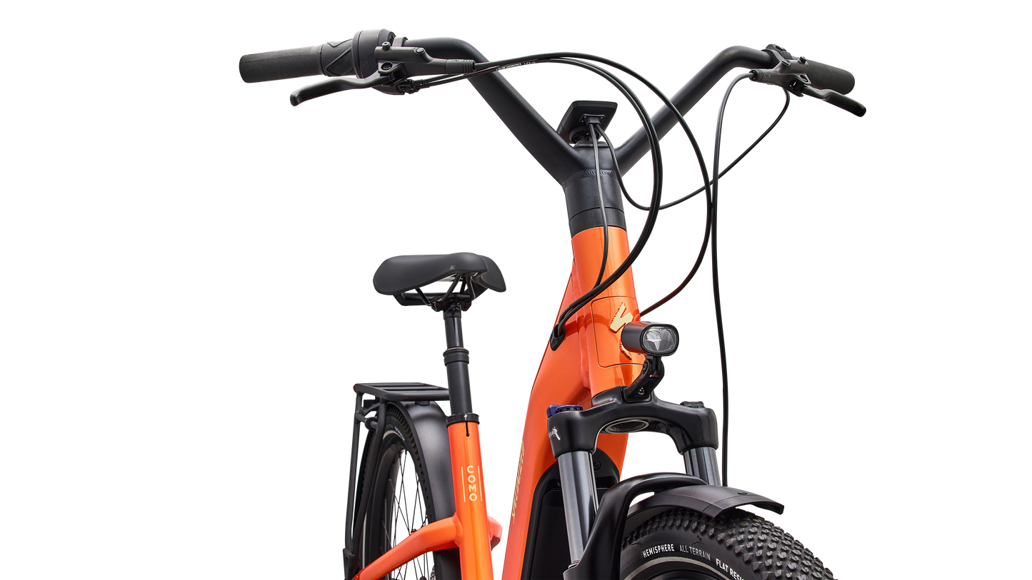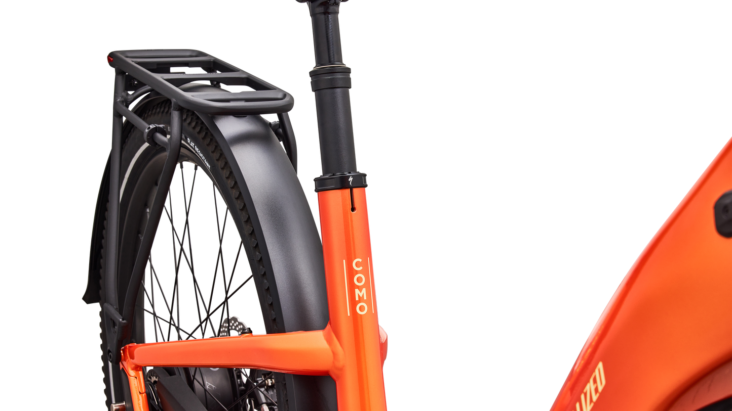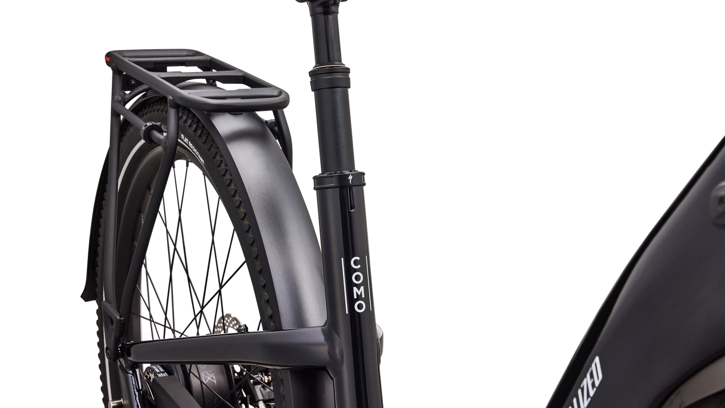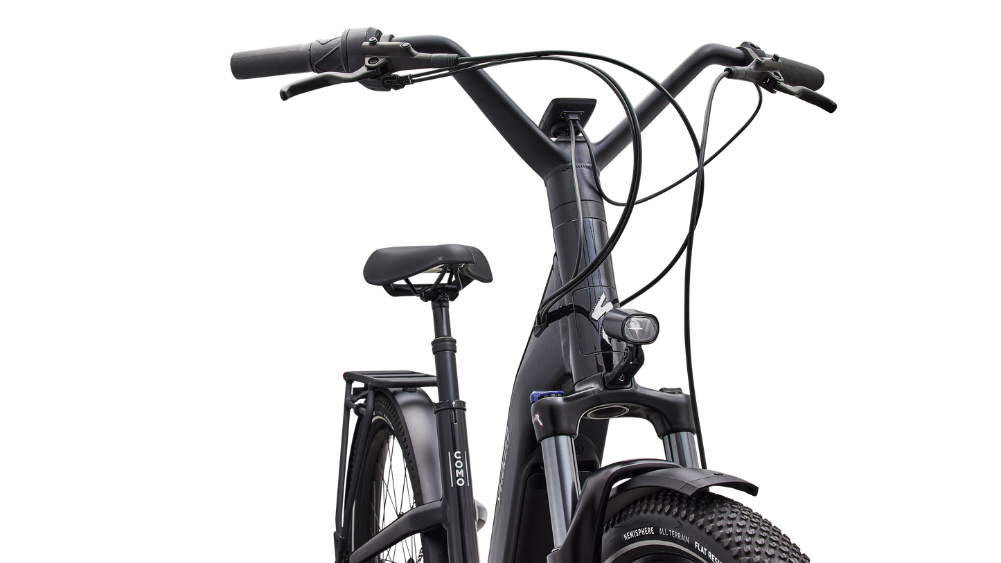 Como is a laid back e-bike with a clean look and upright rider position for convenient comfort and style. This full-power electric bike was designed for city streets and comes equipped with fenders, lights, and a low step-through frame, making it perfect for daily commutes or riding around town. Como offers the best combination of power, range, and usability while remaining incredibly versatile. You will never have to sacrifice comfort for style. You’ll find yourself making up errands to ride it again. COMFORTABLE: An upright body position and smooth handling are optimized for all-day riding comfort, confidence, and control. EASY TO USE: The Como's sleek design and step-through frame make the bike an approachable, functional everyday e-bike. POWERFUL: It’s you, only faster — it’s 4x You, to be precise. The Turbo Full Power system senses the force you apply to the pedals and naturally amplifies your effort by up to four times for an experience that makes getting up any hill or to any destination no sweat. Literally. SMOOTH: Stay comfortable in the saddle with an 80mm front suspension fork, higher volume tires, and a plush suspension seatpost that smooths harsh bumps. TURBO: The heart of the Como is its Turbo technology, the advanced and integrated electric bike system that delivers an unequaled combination of power, natural feel, anti-theft functions, training tips, and a full-function bike computer. SECURE: Como has anti-theft on lock. Thwart would-be bike thieves by disabling the motor with a press of a button so nobody can turn the motor back on without your personalized pin. For additional protection, the Como's battery locks in the bike, or can be easily taken with you. Beat it, bandits. SILENT: Turbo Full Power Motor provides smooth, quiet, and seamless amplification for a quiet ride on any terrain. The speed limit at which the motor will stop supporting may vary significantly by region and is based on local requirements. It may also affect range: a higher speed limit may result in less range. Turbo Full Power 2.0 motor and 710Wh battery offer an unparalleled riding experience, providing a smooth, seamless, and shockingly quiet amplification of your efforts, up to 28 mph. The integrated controller responds to your pedal inputs resulting in intuitive amplification of your efforts with an incredibly natural feel.