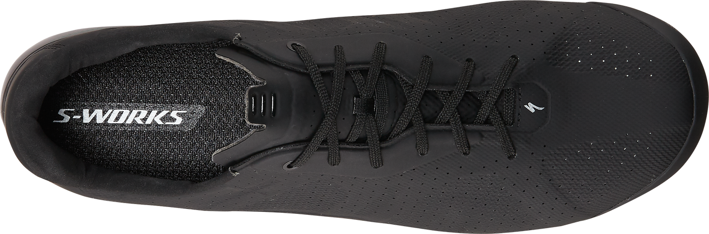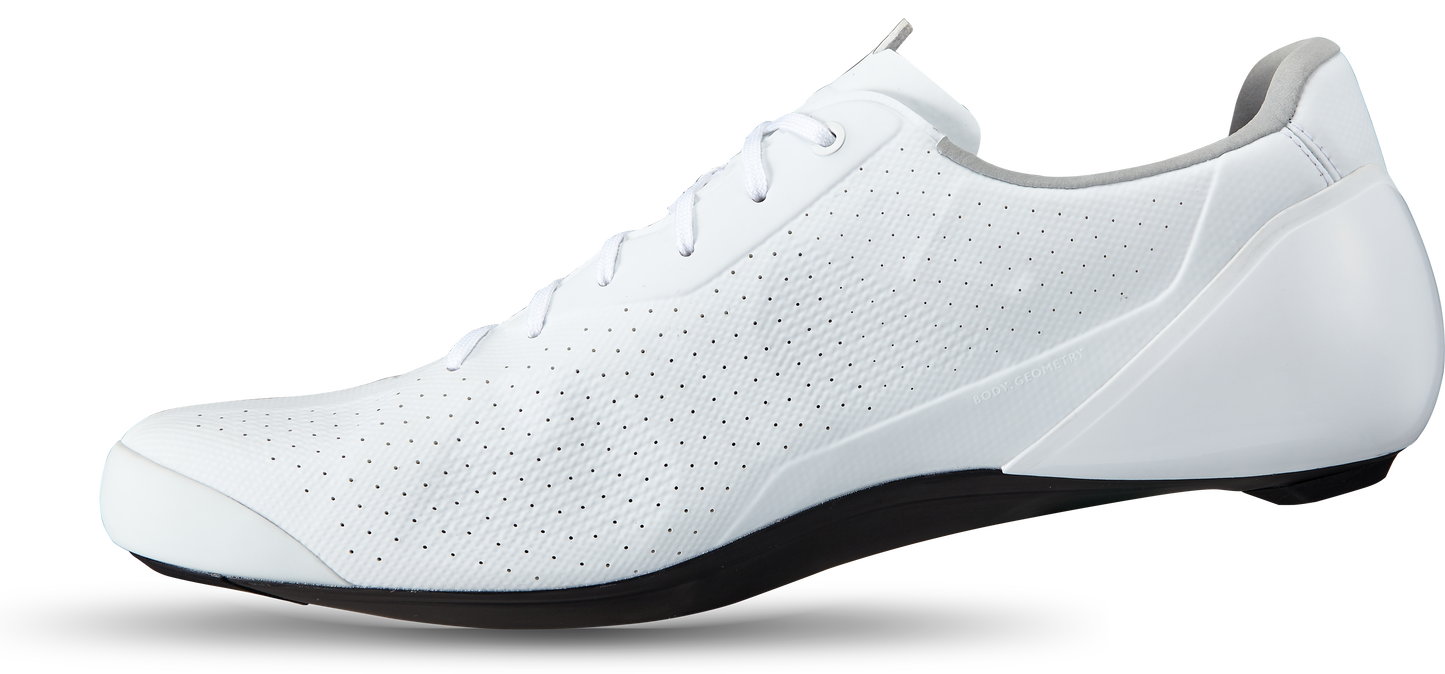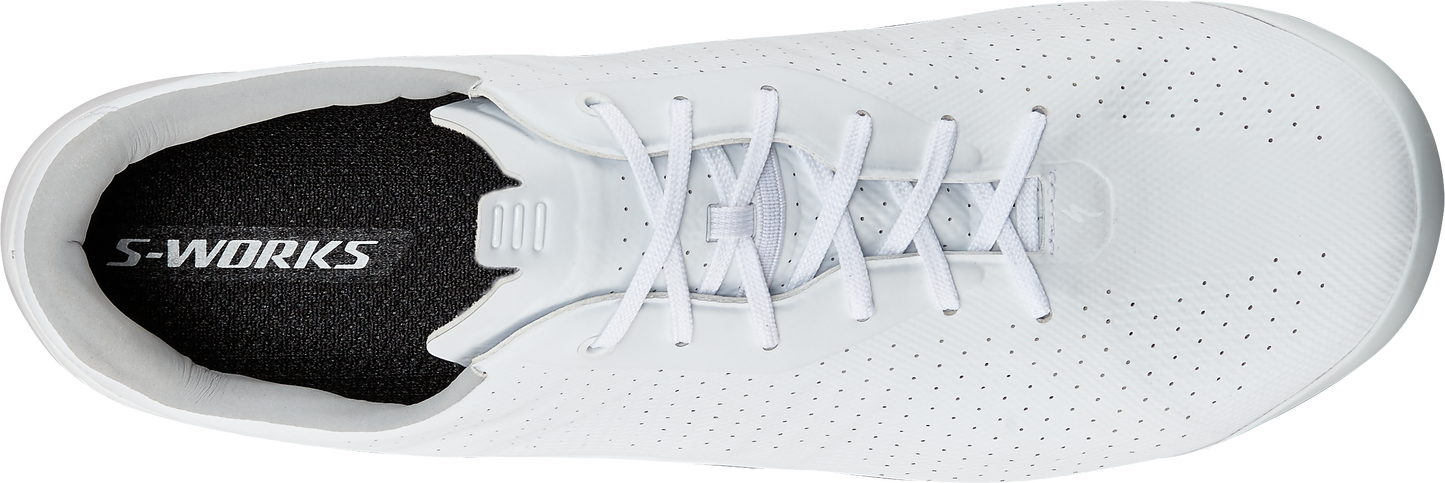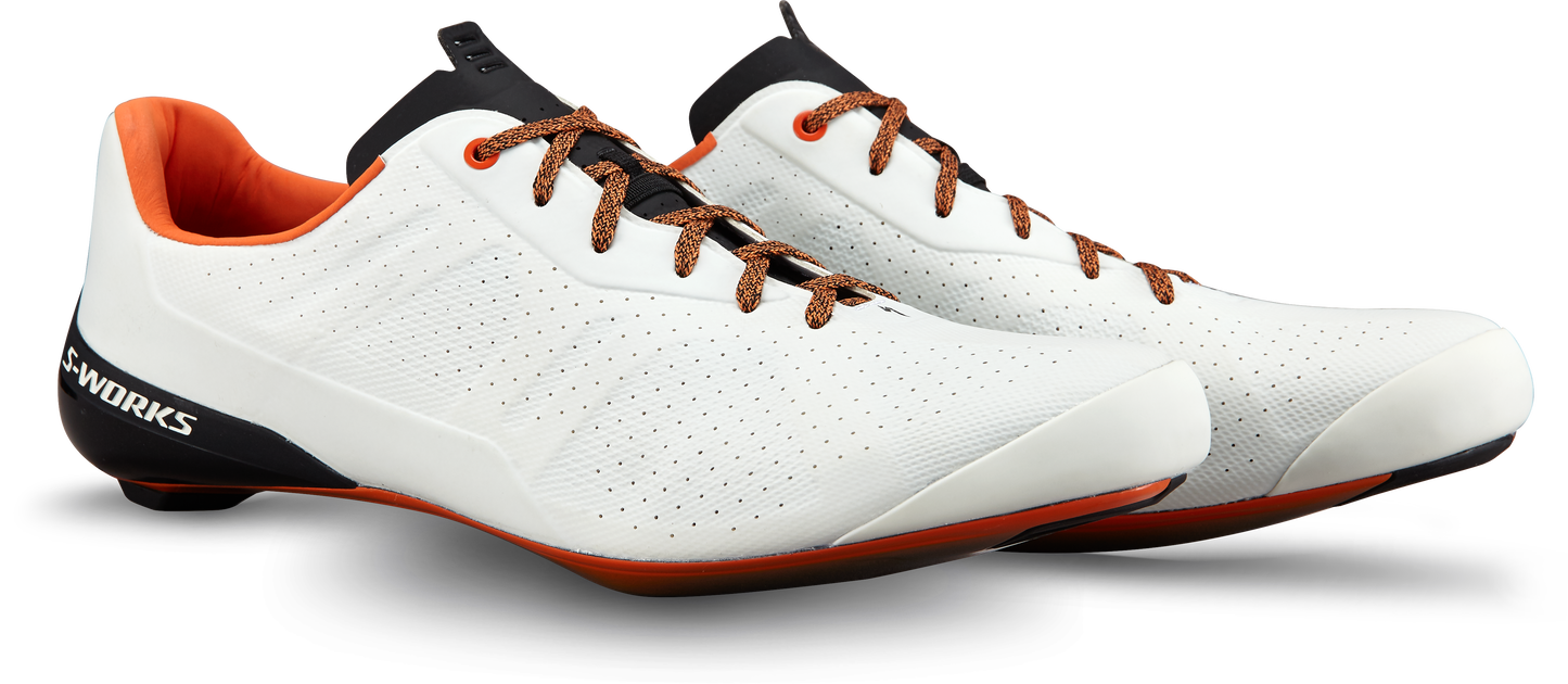 The all new S-Works Torch Lace delivers the timeless, refined style of a lace up with an unprecedented level of efficiency, lightweight, and comfort thanks to Body Geometry. It all adds up to a shoe that disappears on your foot, yet begs to be seen. Like every shoe we make, the S-Works Torch Lace starts with Body Geometry - identify a problem, solve it with design, validate it with science - to improve comfort, increase performance, and reduce the chance of injury for every rider. Comfort: The S-Works Torch Lace utilizes our new forefoot shape - 4mm wider than the S-Works 7 - based on extensive 3D foot scans and Retül data. The upper features remapped zonal layering throughout. It remains incredibly supple to adapt to different foot shapes, yet won’t stretch over a long day in the saddle to ensure a secure, consistent fit. An asymmetric heel counter reduces hard touch points against the ankle, and still delivers knee stability validated by our Human Performance team. Efficiency: Every Body Geometry shoe optimizes ankle, knee, and hip alignment for a stable and pedal stroke with our patented Varus Wedge, a 1.5mm outward tilt to the outsole. Thanks to the light weight retention of laces and watching every gram - from the carbon outsole to the upper material - the S-Works Torch Lace weigh a feathery 200 grams in size 42. With an internal I-Beam the carbon outsole provides the ideal stiffness-to-weight ratio for big efforts without adding excess grams, optimized by working with the best riders in the world. Style: Beauty is in the eye of the beholder, and those that see the S-Works Torch Lace will get to admire them as long as they can hang on your wheel. With classic lines, and understated color ways the S-Works Torch Lace is at home whether you chase finish lines or mountain tops before sunset. New upper features reinforcement in key zones while also offering adaptive fit zones to create a disappearing fit on the foot.